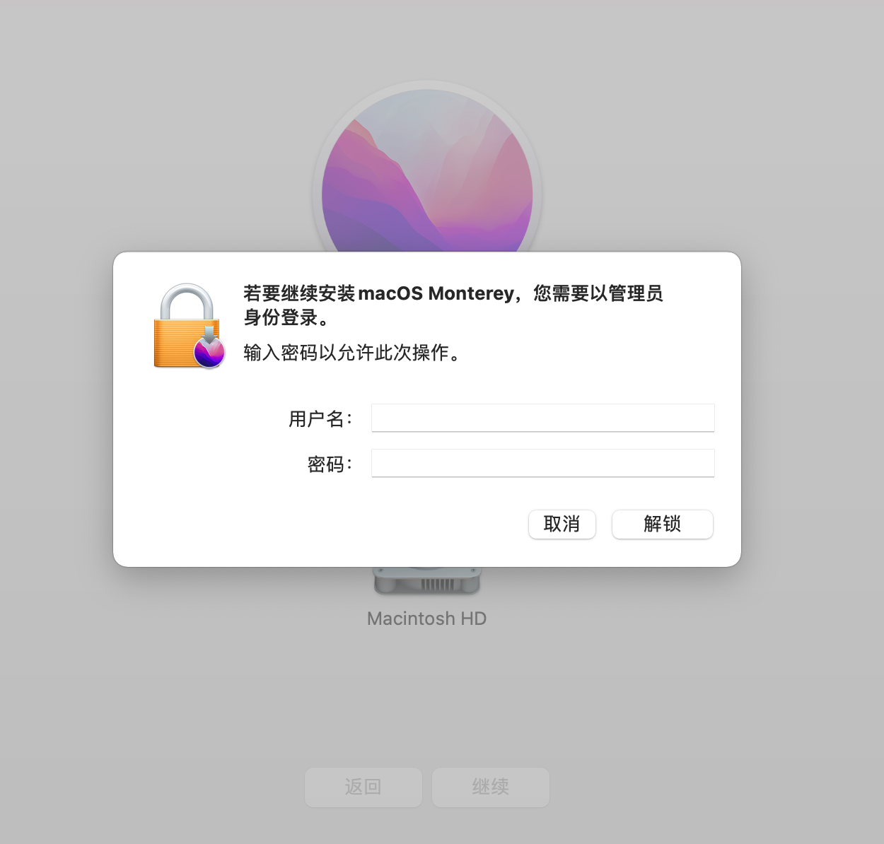 尝试过Apple ID ,和系统的管理员账号密码,一直无法继续!有人遇到过吗