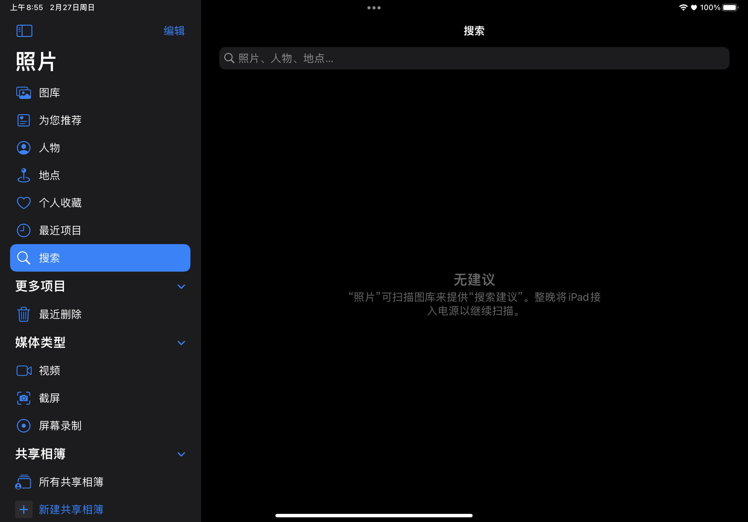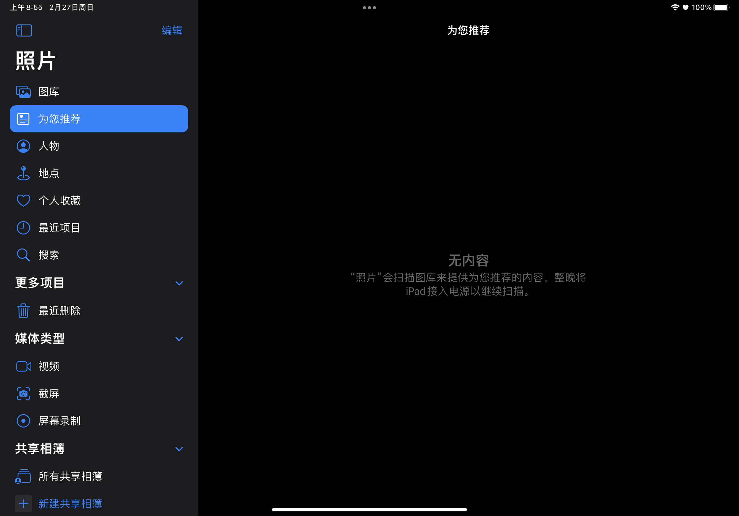 请问你是指目前 iPad 上“照片”App 中的“为您推荐”和“回忆”项目一直未完成扫描,是吗?如果是的话,由于暂时还没有其他社区用户来与你一起讨论或回复你的帖子,在此之前,建议你不妨先尝试以下操作步骤: