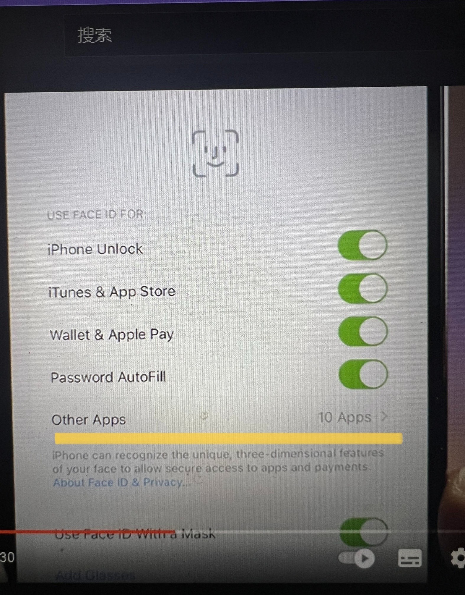 设置 → 面容ID与密码 → 将面容ID用于: 拥有 “Other Apps”功能 (看以下的视频截图)