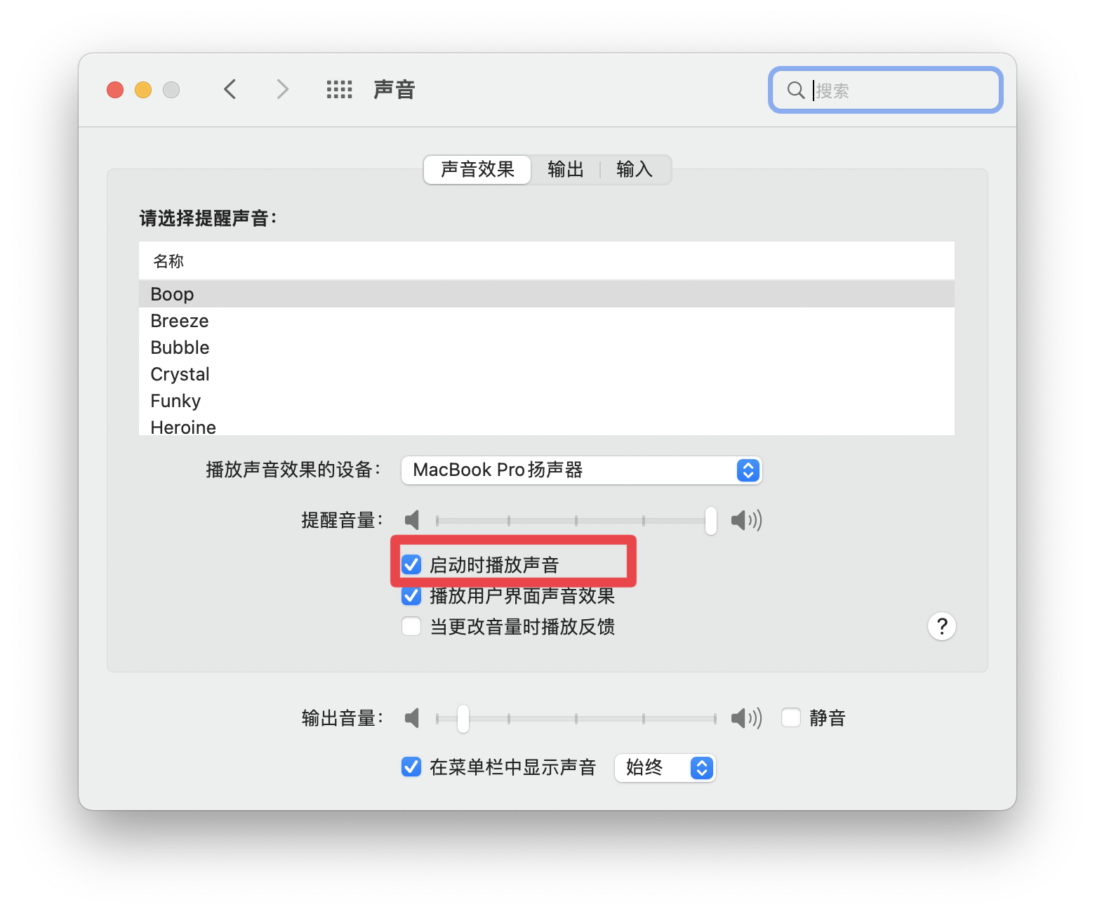 如果您所说的是开机音效,则前往“系统偏好设置”,选择“声音”,点击“声音效果”,看是否够选上了“启动时播放声音”的选项。