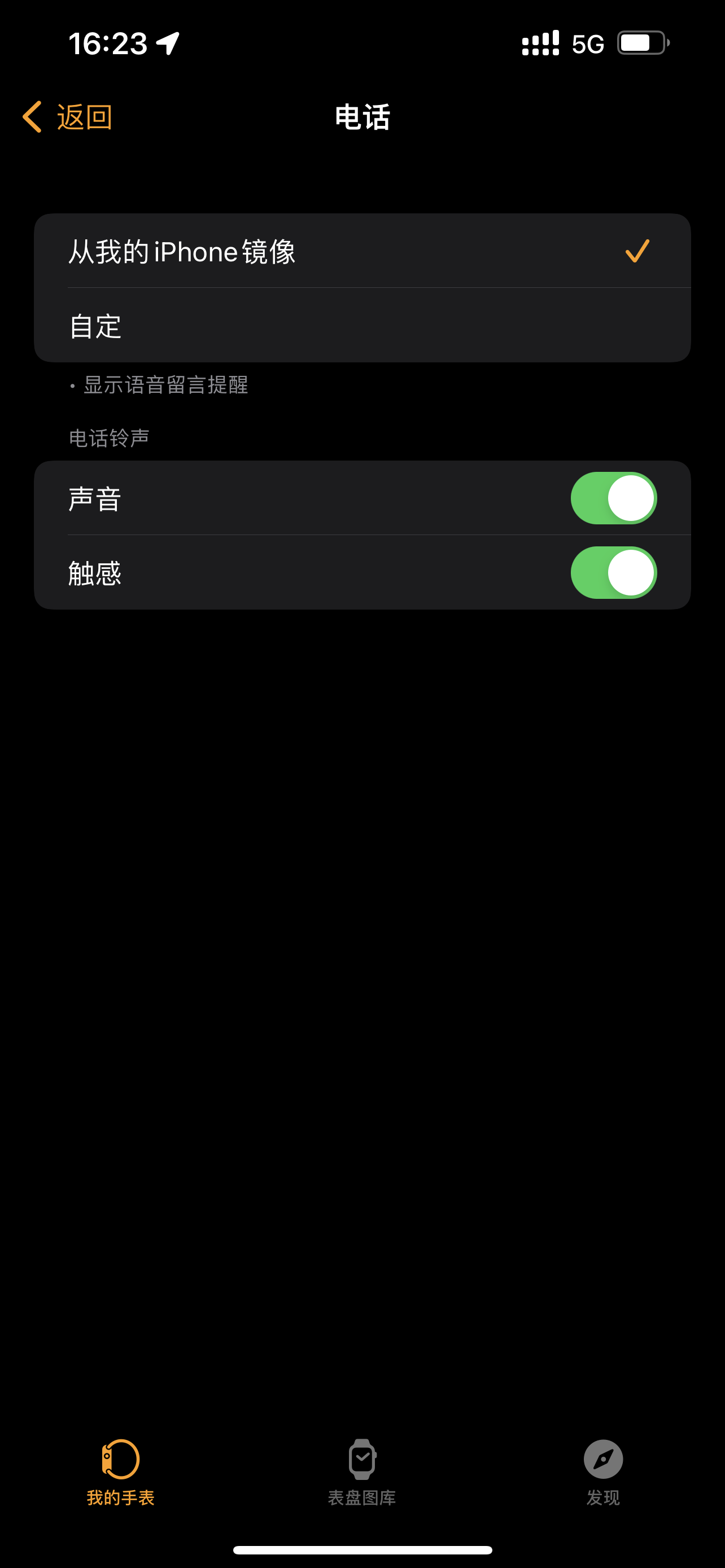 确保手表和手机连接状态。检查watch软件中电话是否选择从iPhone镜像、声音、触感都打开。