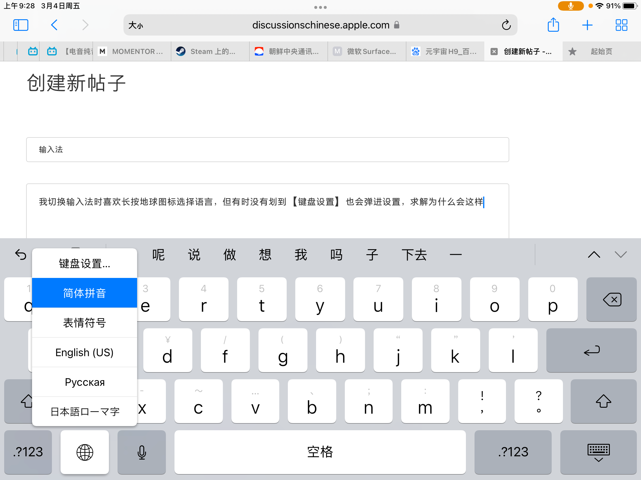 长按地球图标选择语言,有时没有划到【键盘设置】也会弹进设置