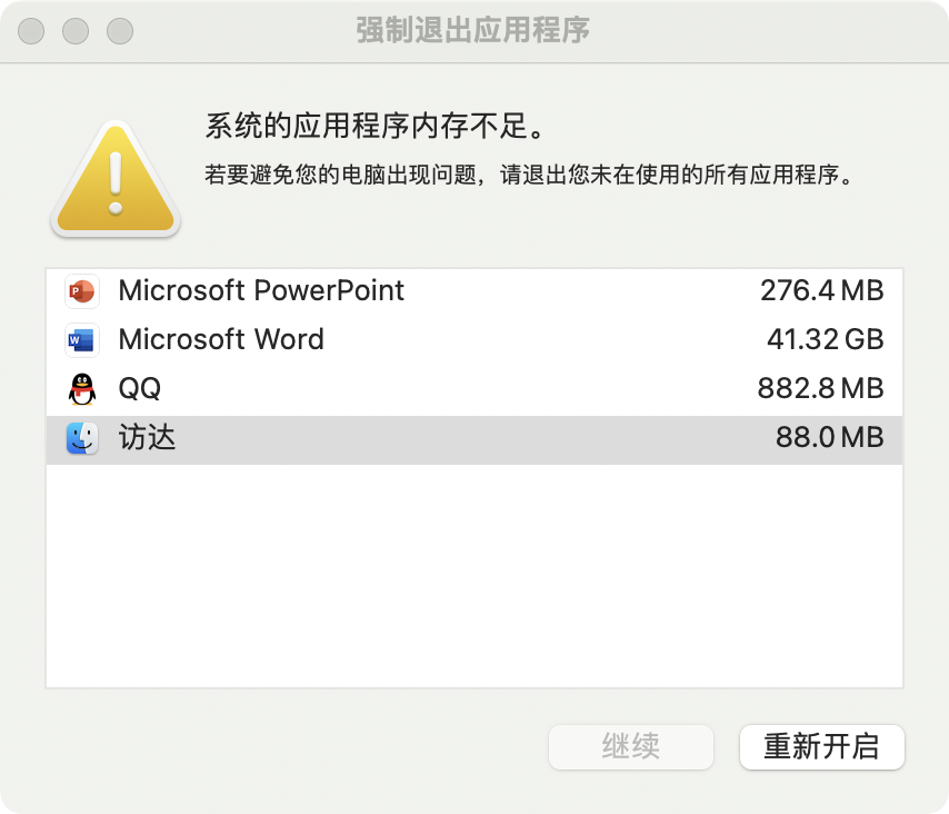 升级到Monterey12.0.1之后,频繁弹出“系统应用程序内存不足”的提示(截图是在我只打开一个word