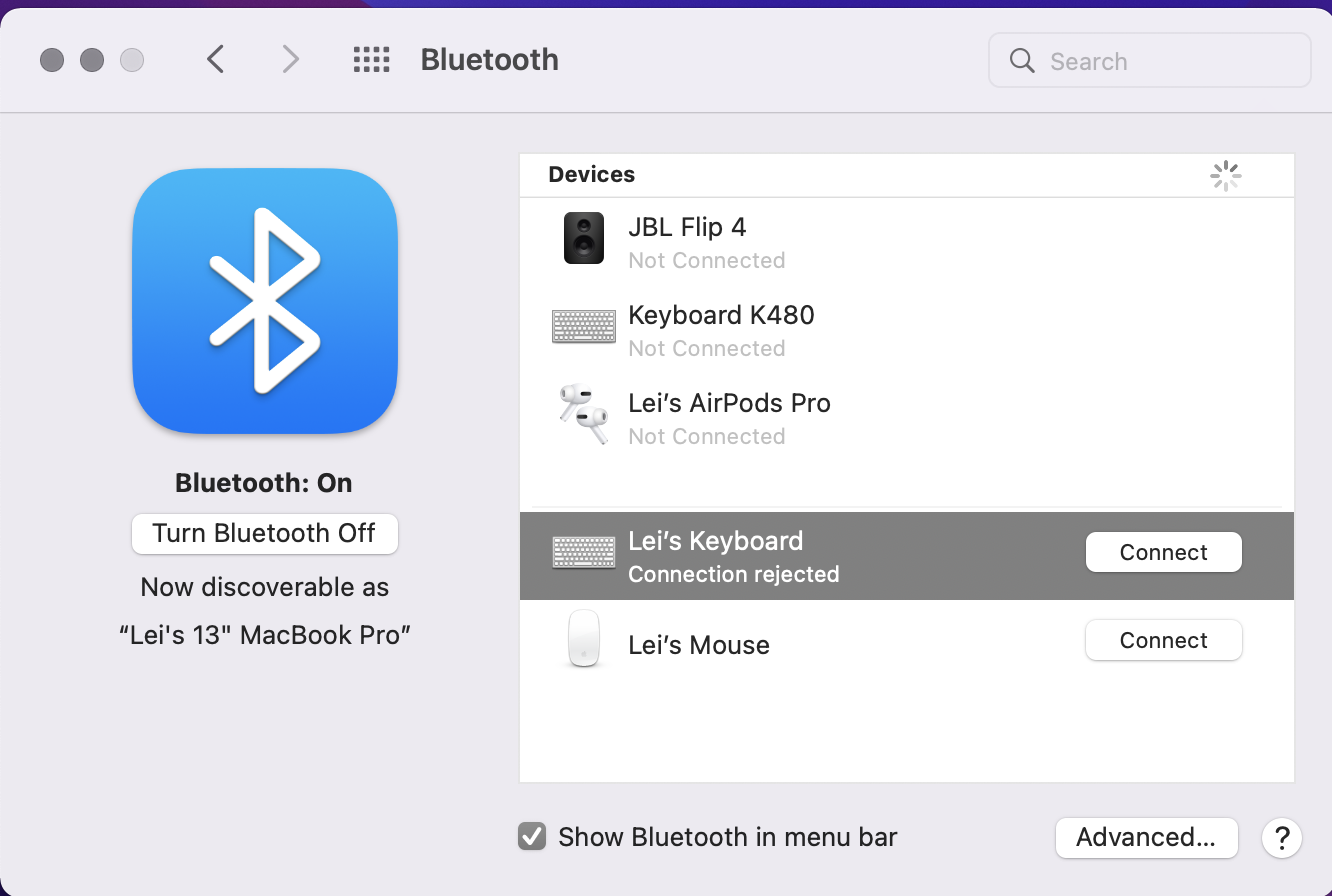 突然有一天,我的苹果Magic Keyboard和鼠标都连不上我的MacBook Pro (2017),试了各种重启,还去了苹果在苏州的专卖店,无济于事。求帮助!
