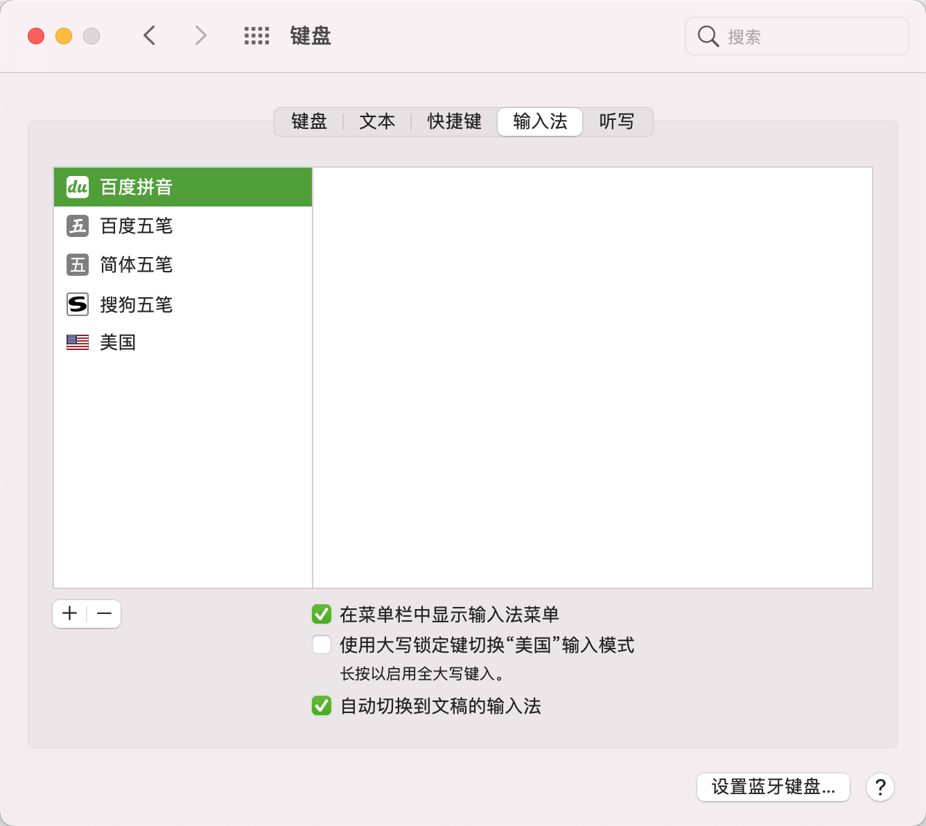 这时再删除掉MAC自带的中文输入法之后,该选项又消失,但因为我之前已经取消勾选选项,所以也没有再出现大写切换美国输入法的情况了。