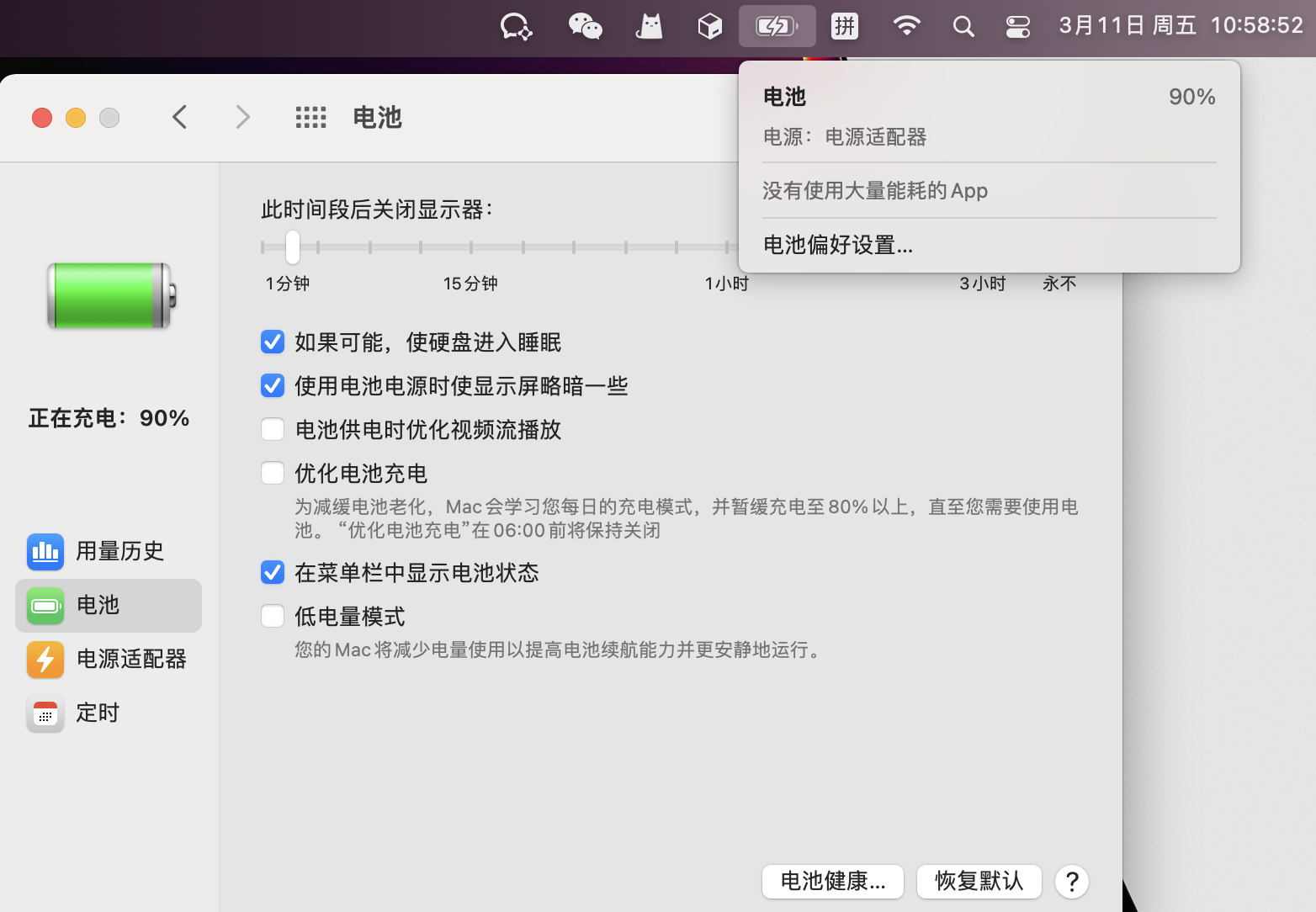 长时间地维持在 100% 的高水平电量反而不利于电池健康。Mac 会学习您的充电习惯,当判断您长时间接入到电源时,会暂缓充电,并调节电量到合适水平。