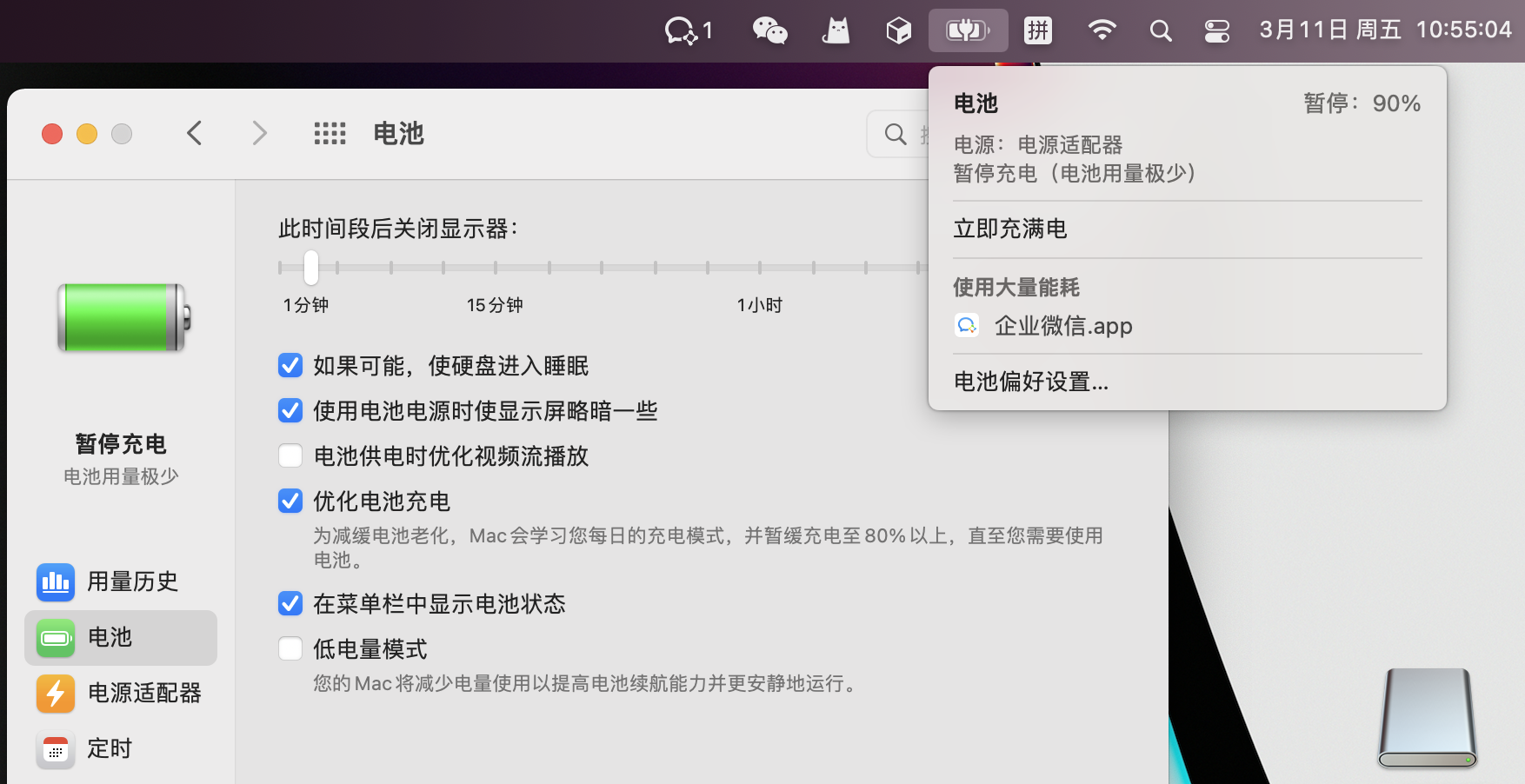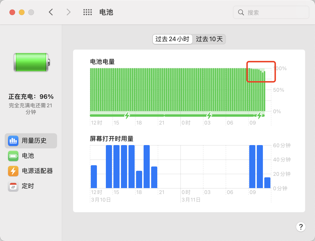 这个过程是完全自动的,充电的行为取决于对您的使用习惯的学习。您可以保持规律的电池使用习惯从而让系统更好地帮助您管理电池健康。若您不想启用此功能,可以在“系统偏好设置”的“电池”偏好设置中关闭相应功能。