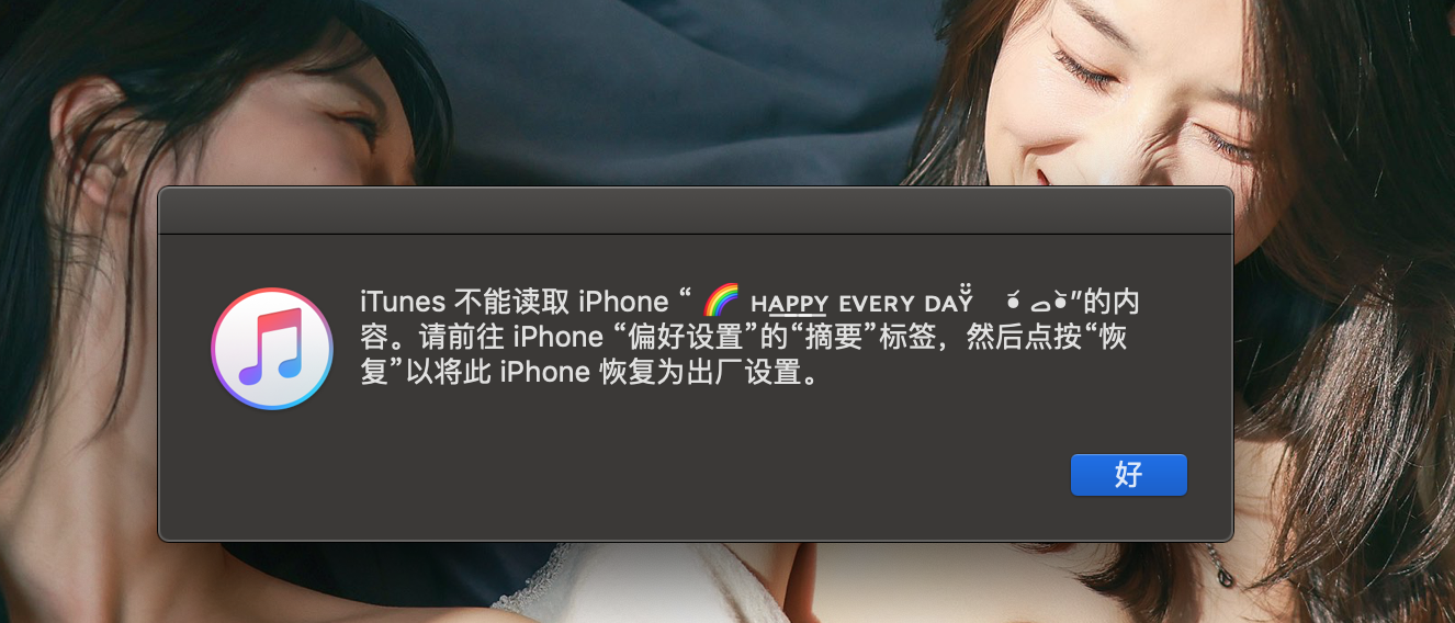 iPhone在连接MacBook pro电脑时,总是弹出图片中的对话框,这个问题已经存在很长时间了。手机没有维修过,电脑没有维修过,升级系统均为正常升级,数据线为原装线,在刚买手机的时候是可以连接iTunes的,尝试过电脑系统降级,重装系统,也尝试过升级最新版本,还是有上述问题,因为手机上的资料比较重要,所以没有尝试还原手机系统,不知道有没有人知道这是什么原因导致的,怎么解决?
