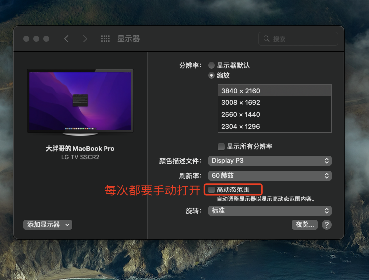 显示器的HDR功能在关闭电脑和显示器之后。再连接时需要进入 mac显示器设置中重新打开HDR