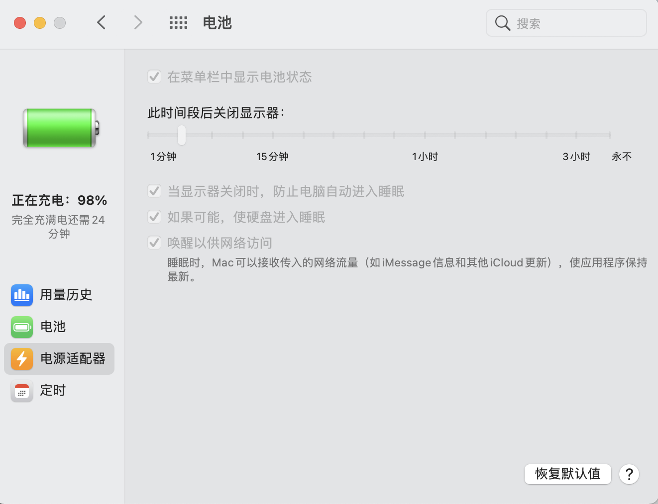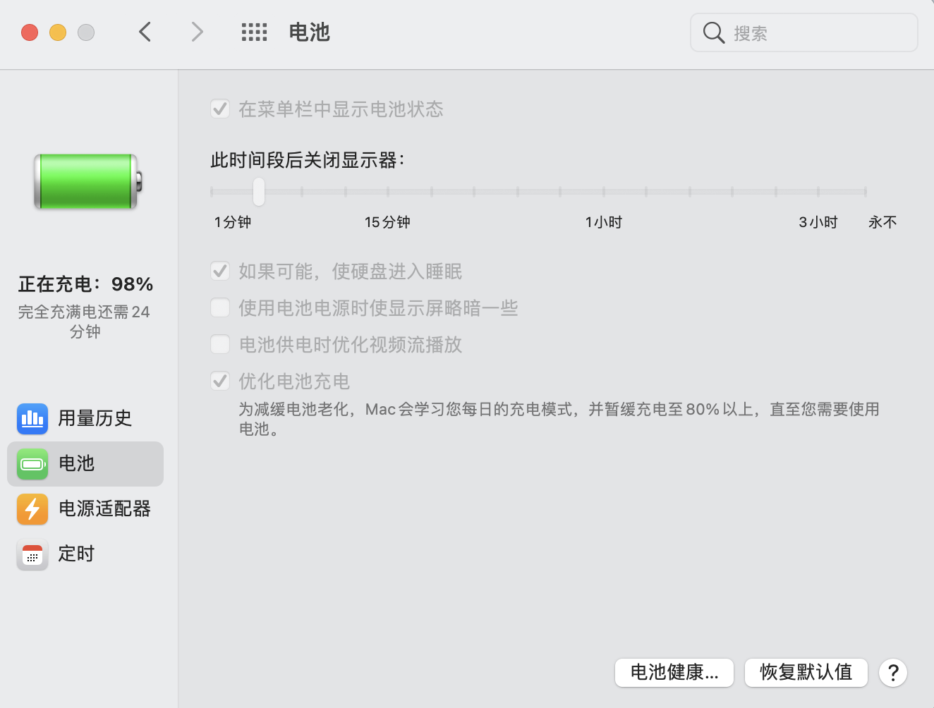 打开“电池偏好设置”之后,所有选项均为灰色,无法改变勾选的状态,如下图所示。