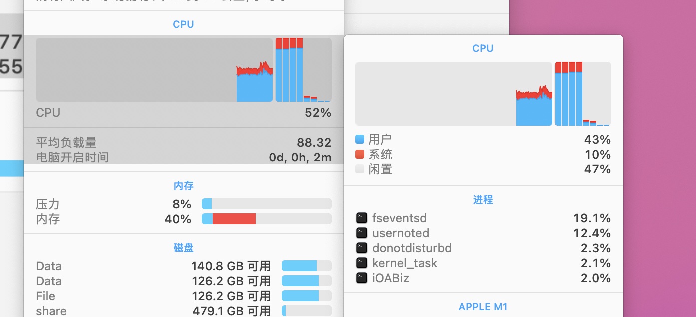 2020款m1 mbp 电脑开机fseventsd和usernoted进程一致都很占用cpu,不管开机多长都是四个核心都是满的,