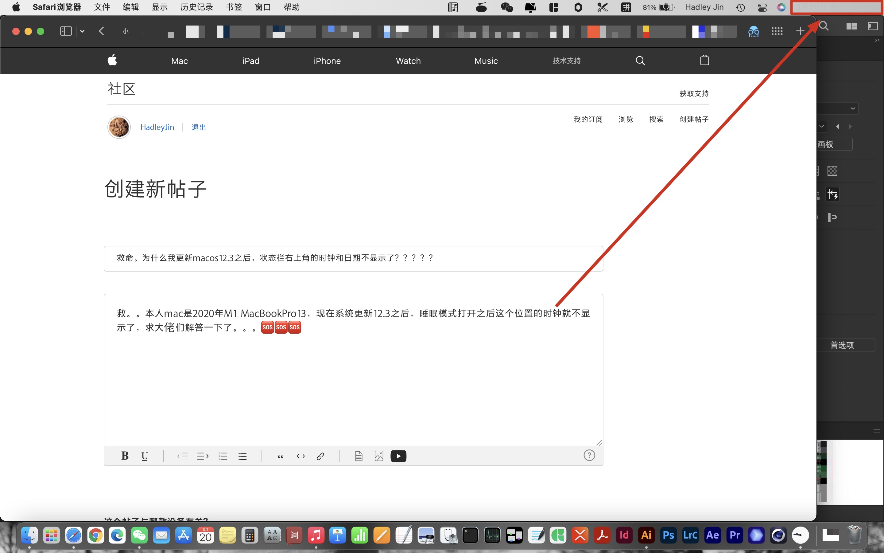 为什么我更新macos12.3之后,状态栏右上角的时钟和日期不显示了?