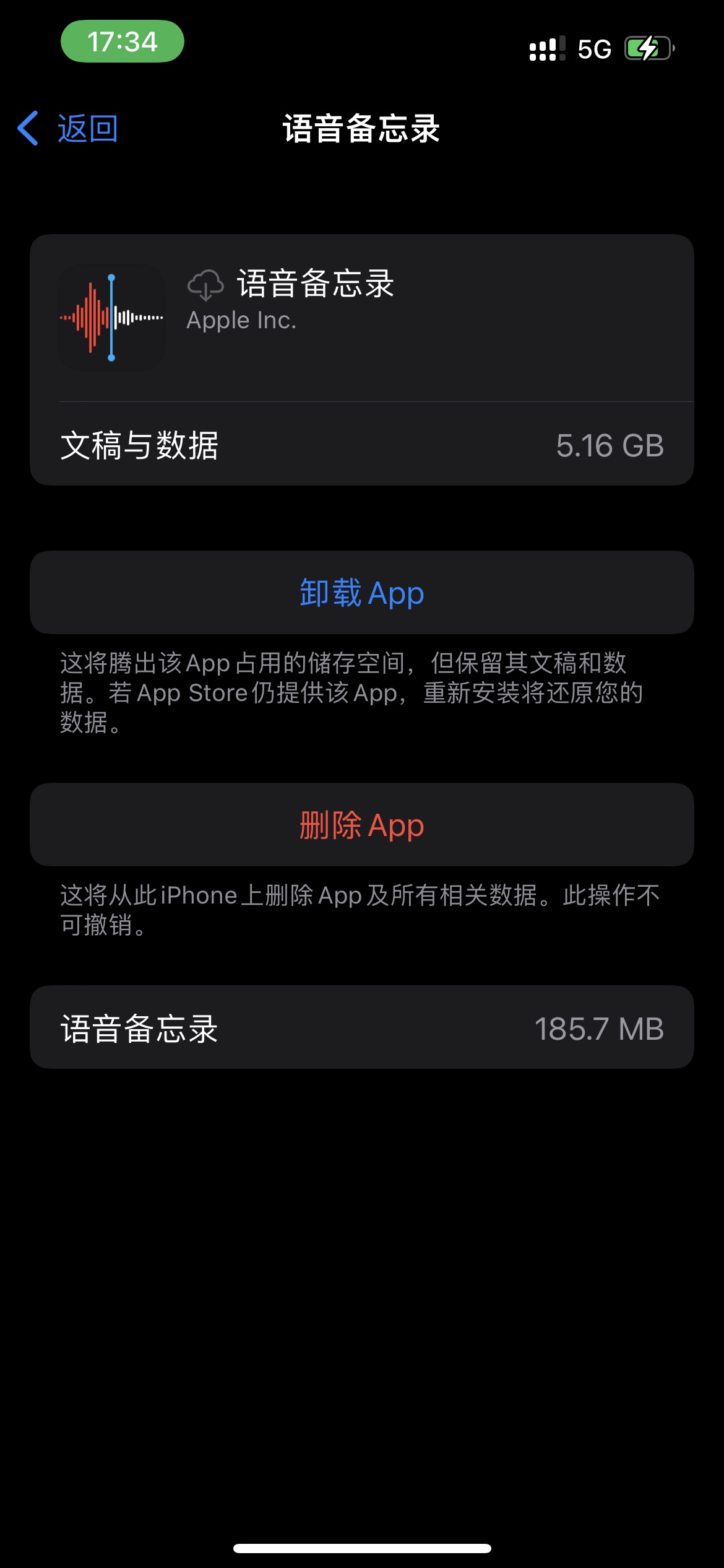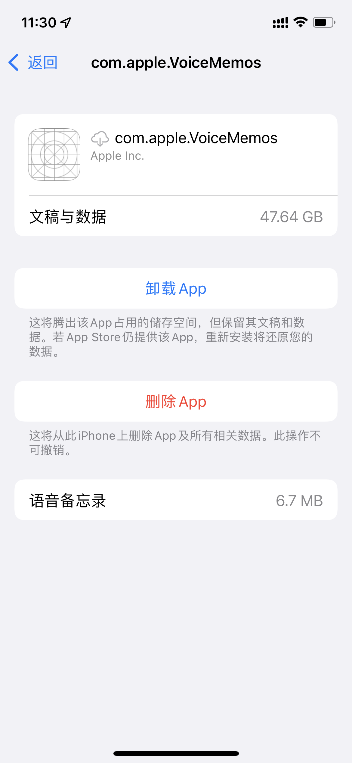 语音备忘录文稿与数据突然达到47个G,但是里面的录音文件只有几百M,删除app后重新下载仍未解决。图二是删除后的显示情况。