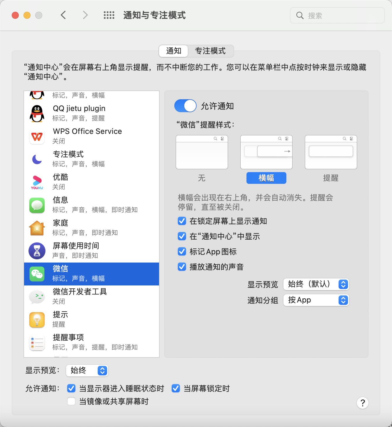 我用的是Macbook pro2018 款的,系统是macos Monterery,为什么系统睡眠的时候无法在屏幕显示微信消息呢?要怎么设置才能解决这个问题呢?该设置的我已经设置了,不该设置我没有去设置: