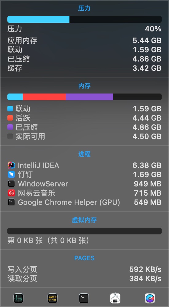 5. 打开“活动监视器”App,查看内存使用率,如果内存压力呈现黄色、红色或出现峰值,请检查 App 是否占用了所有内存并导致内存压力增加。如果不再需要运行 App,你可以退出该 App。