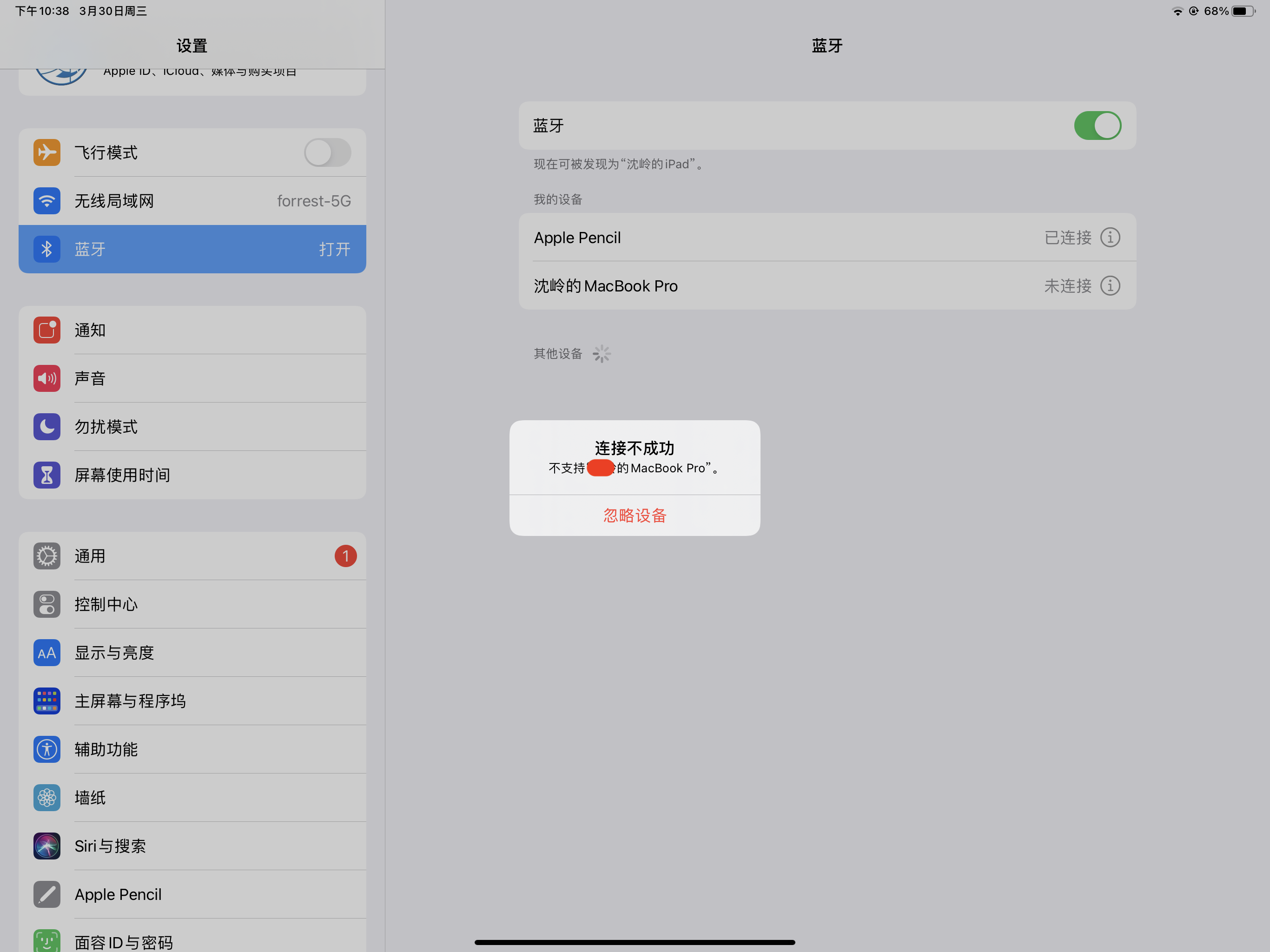 目前发现蓝牙连接不上,导致无法使用“随航”功能。是MacBook M1Pro芯片的原因吗?但是我之前好像是连接过的啊。希望能尽快答复,谢谢!