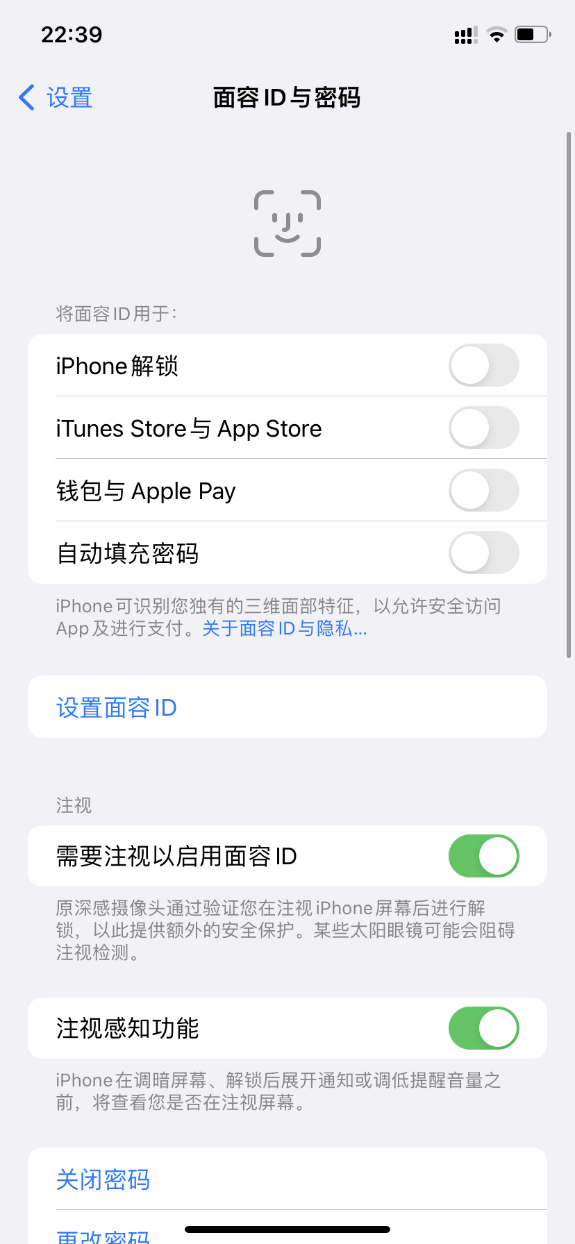 要检查您的面容 ID 设置,请前往“设置”,然后轻点“面容 ID 与密码”。确保已设置面容 ID,并且您尝试与面容 ID 搭配使用的功能已打开。