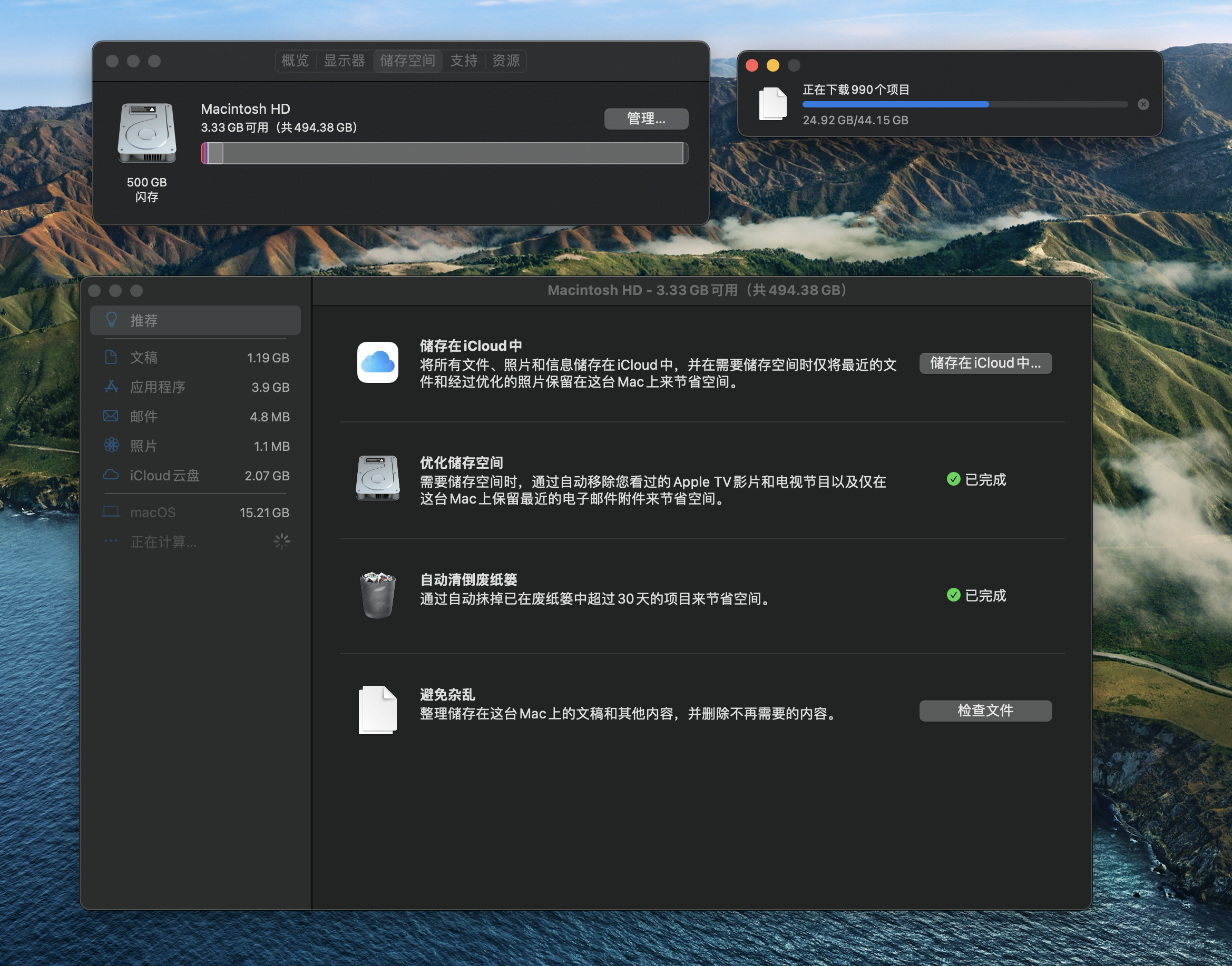 我的新MacBook pro。登陆了我的iCloud之后,就自动进行下载。也找不到下载的内容。但是空间被占满了。退出账户之后,这部分系统占用就没了。有办法解决吗?或者有大神知道这些是什么内容吗?