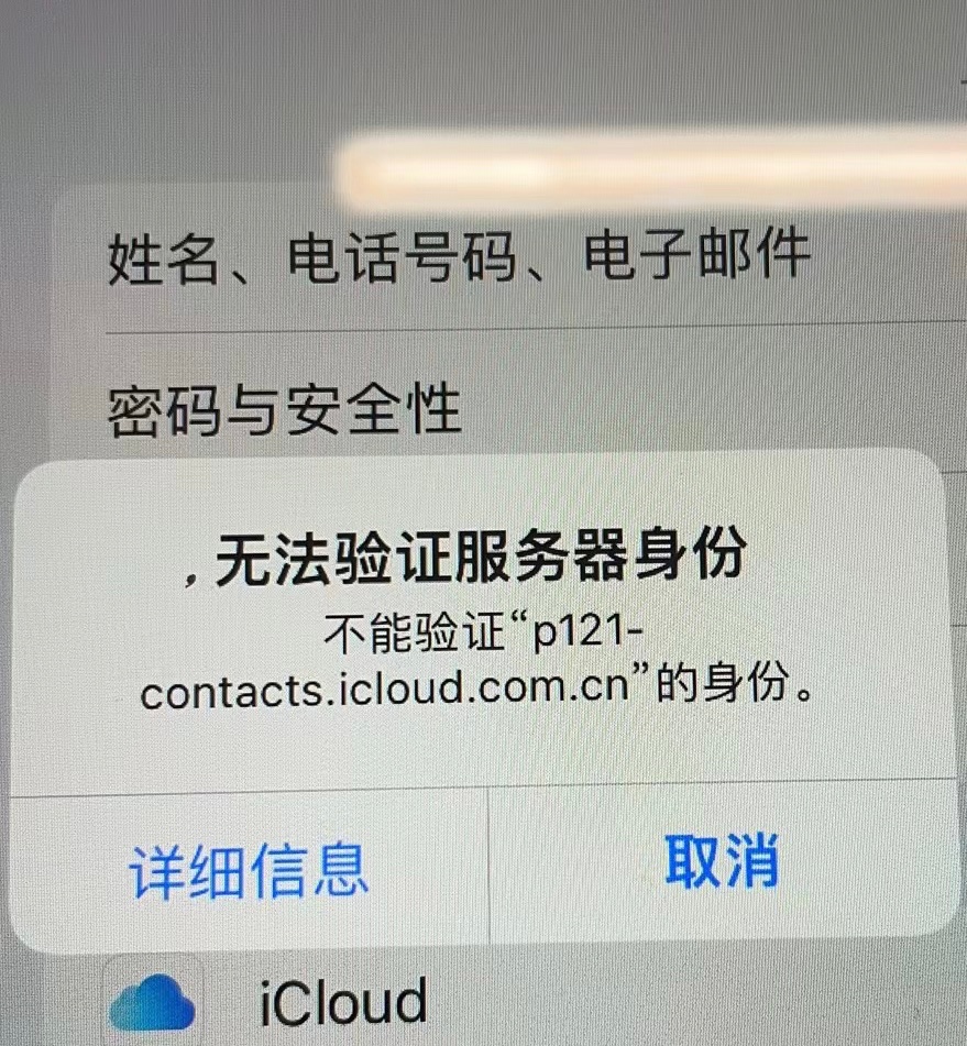 手机和ipad都会出现无法验证服务器身份不能验证“p121- contacts.icloud.com.cn”的身份