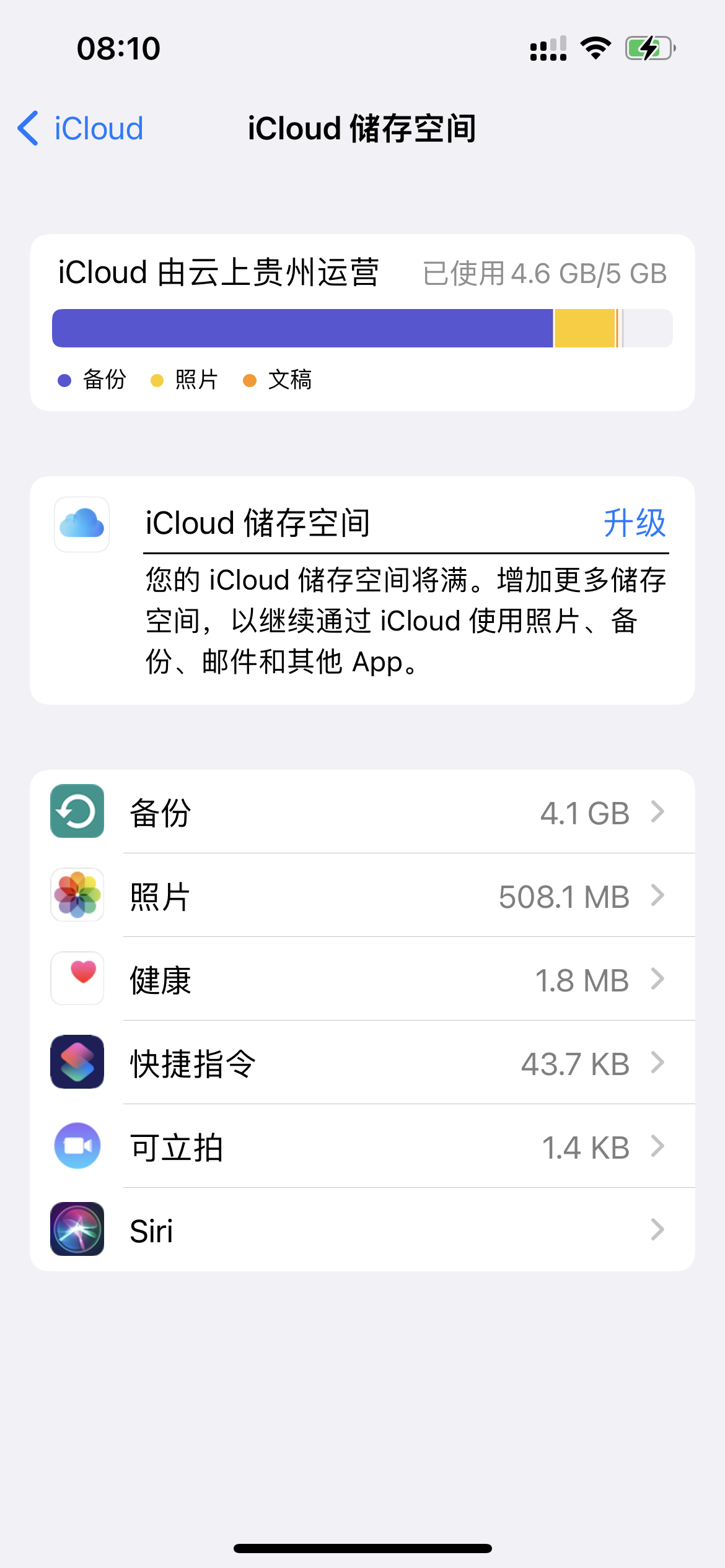 iCloud管理储存空间时,发现有一个“备份”占用了4个G内存,点进去却显示0kb