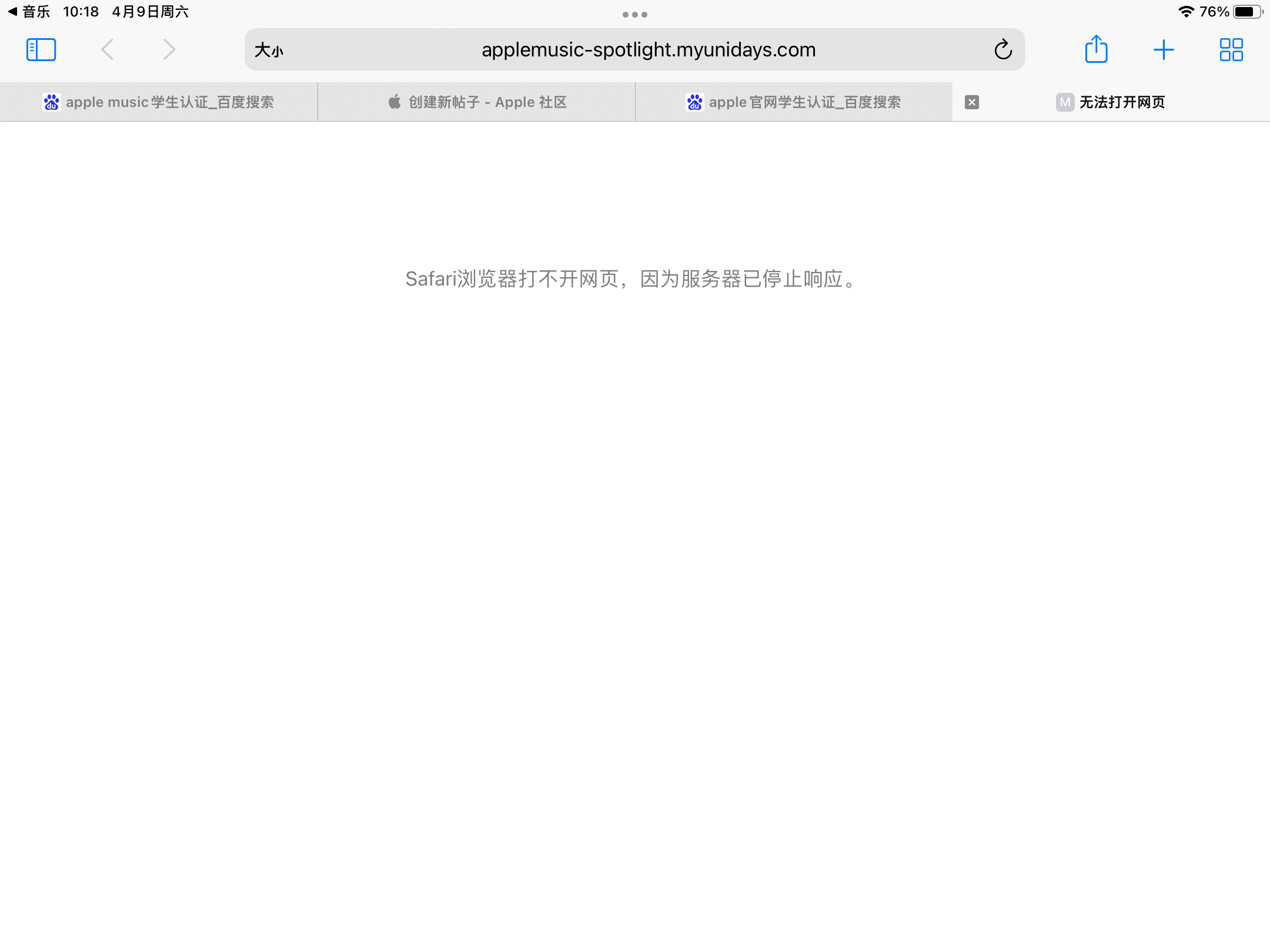 apple music 学生认证页面跳转后,打不开网页,服务器停止响应。