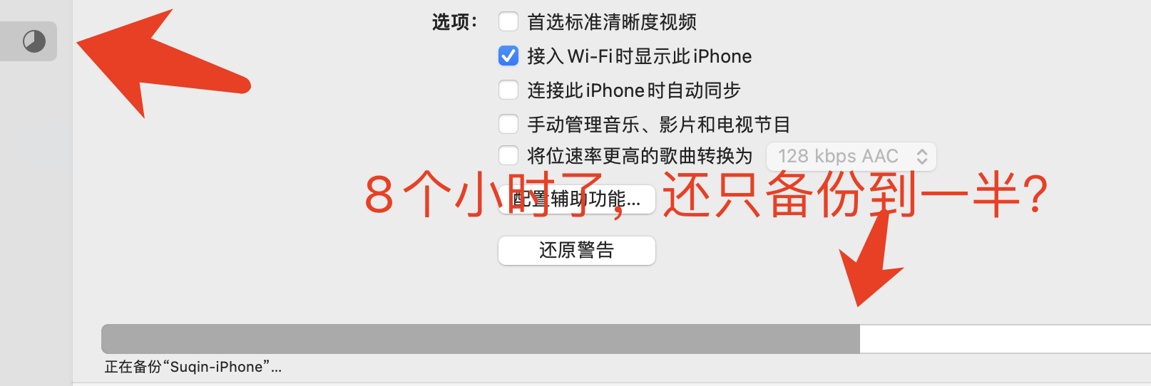 iphone通过数据线连接imac,访达备份iphone全部备份。备份速度非常慢,备份了12个小时,没还有备份完?