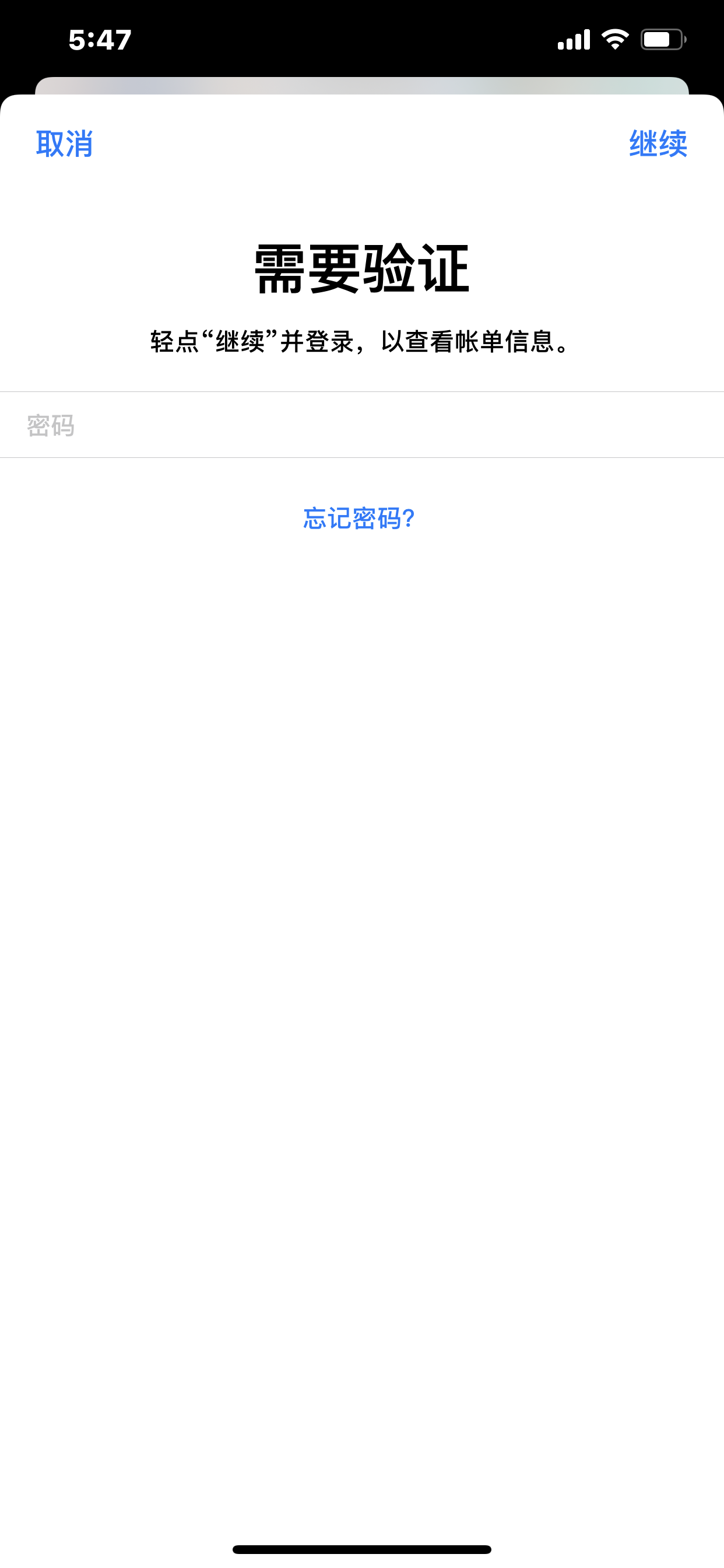 - 请按照操作提示输入密码后点击“继续”,完善账单信息。