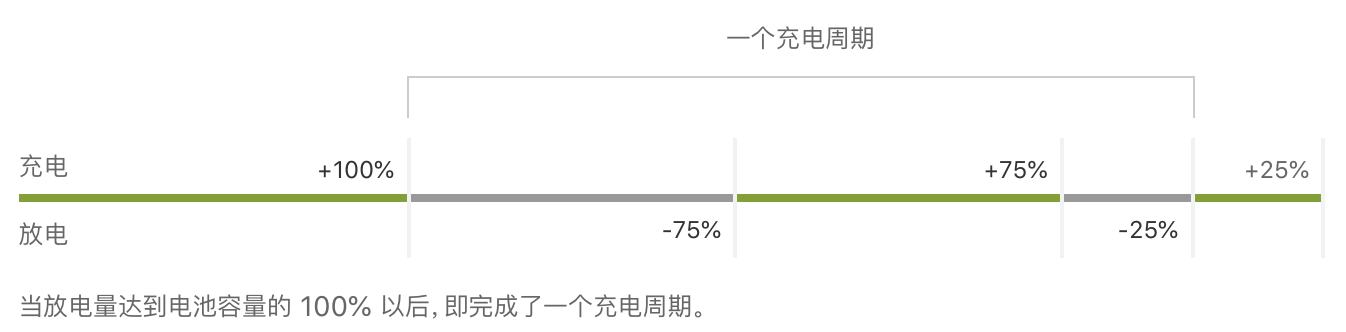 Apple 锂离子电池以充电周期方式工作。如果使用 (放电) 的电量达到电池容量的 100%,你就完成了一个充电周期,但不一定通过一次充电来完成。比如,你可能一天使用了 75% 的电量,然后在夜间将设备充满电。如果你次日使用了 25% 的电量,那么总放电量将达到 100%,从而两天累计完成了一个充电周期。也可能需要几天时间才能完成一个充电周期。