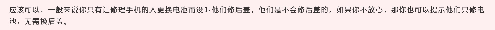 问题被标记为 排名最靠前的回复 以下用户的用户个人资料: PeterLee0991 PeterLee0991 用户级别: 级别 6 17,099 积分 2022年5月12日 上午1:55 回应 kimi_fly 这个要看您在哪里维修,如果是Apple官方,可能不可以,因为在维修之前,必须做VIM目视检查. 如果iPhone已经发生其他物理损坏, 更换电池的操作可能存在安全隐患, 官方一般不会让顾客冒这种风险.(即便是您自费)如果是自己找维修点,可能可以. 电池只要没有破,机身没有弯曲,是可以换电池的.如果后盖不维修也不影响正常使用,你可以套一个手机壳就行了. 回复 链接