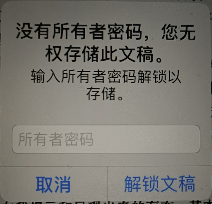 在图书app中编辑后需要所有者密码才能储存?这个所有者密码是什么?我尝试了apple ID的密码,也不是锁屏密码,以前加进去的文档都可以编辑,新加的文档就不可以编辑了。如何取消这个所有者密码?