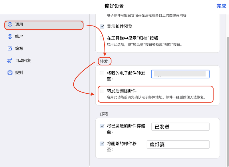 进入iCloud邮件偏好设置面板,点击“通用”向上轻扫找到“转发”然后关闭“转发后删除邮件”就解决了.