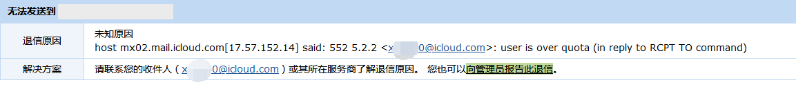 host mx02.mail.icloud.com[17.57.152.14] said: 552 5.2.2 <x****0@icloud.com>: user is over quota (in reply to RCPT TO command)