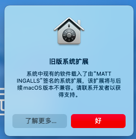 扩展将与后续macOS版本不兼容,联系开发者以获得支持。
