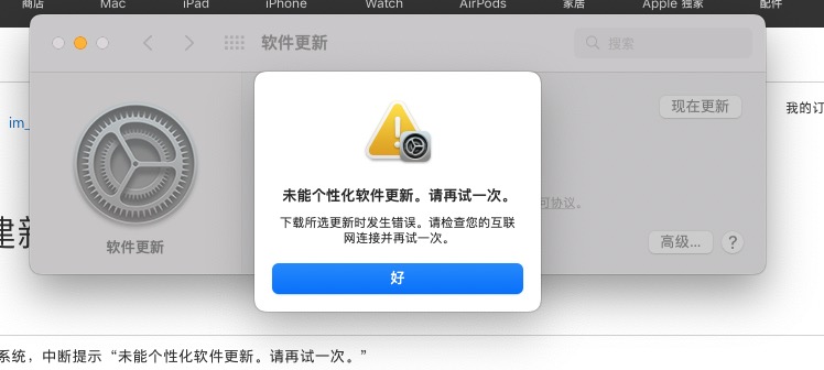 更新系统提示“未能个性化软件更新。请再试一次。”如何解决