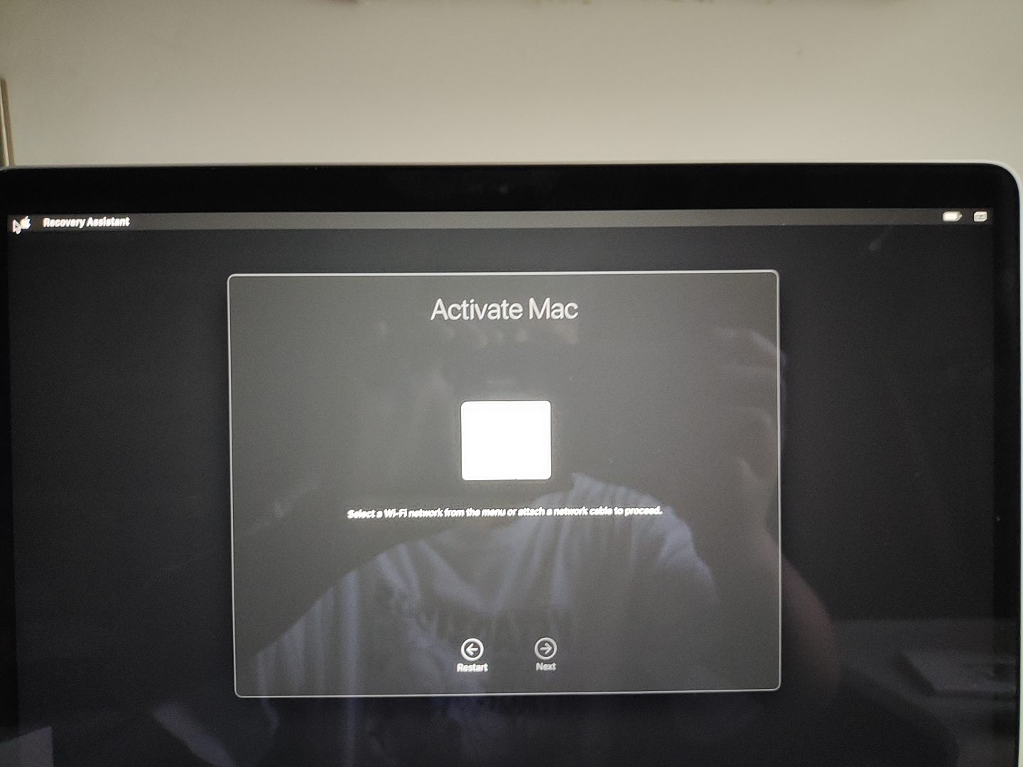 刚才按照系统提示更新系统,更新后电脑自动重启,然后就进入了恢复助理,要我激活Mac,让“从菜单中选择wifi网络或连接网线以继续”,但是菜单里面都没有wifi选择,开热点也没有显示,也不能点“下一步”,我要怎么处理?
