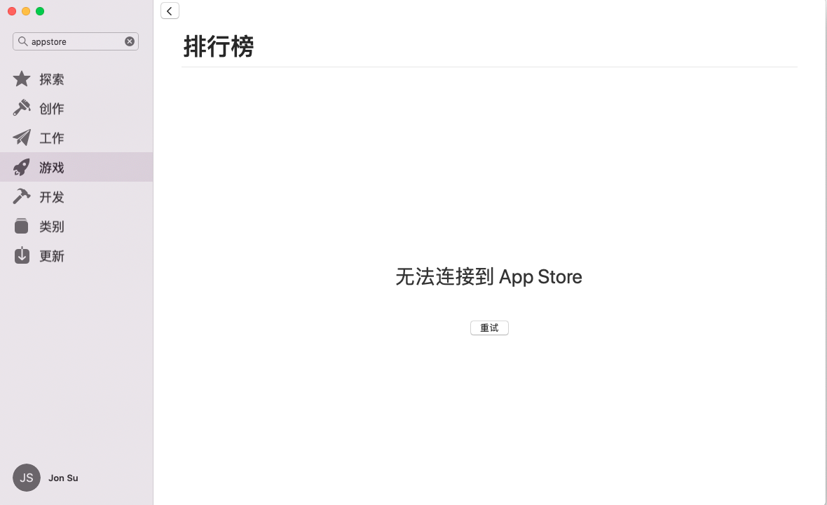 AppStore-游戏-免费游戏排行或者付费游戏排行-查看全部,就会显示:无法连接到App Store 其他功能全部正常