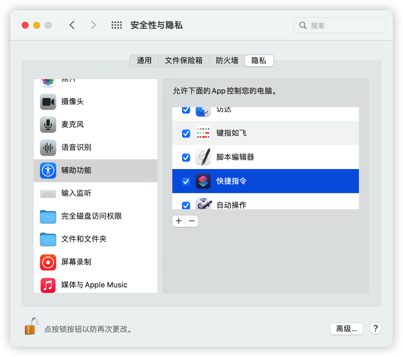 版本 Monterey12.4,1、快捷指令-允许运行脚本的选项,总是被自动取消,经常发生在休眠一段时间后。2、还有AppleScript总是提示不能发送按键,隐私权限都给了