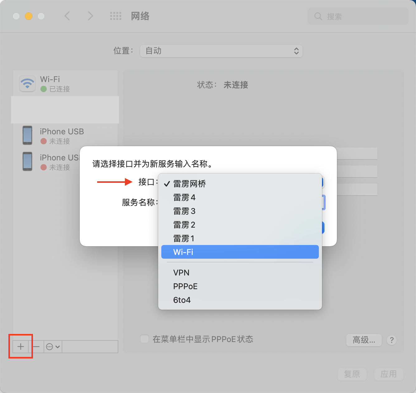 打开“系统偏好设置”,点击“网络”,点击左下角的“+”以创建一个新的服务。在“接口”一项中选择“Wi-Fi”。然后点击右下角的“应用”以保存修改。此时应该就可以在“Wi-Fi”设置中或者菜单栏的控制中心中连接 Wi-Fi 网络。