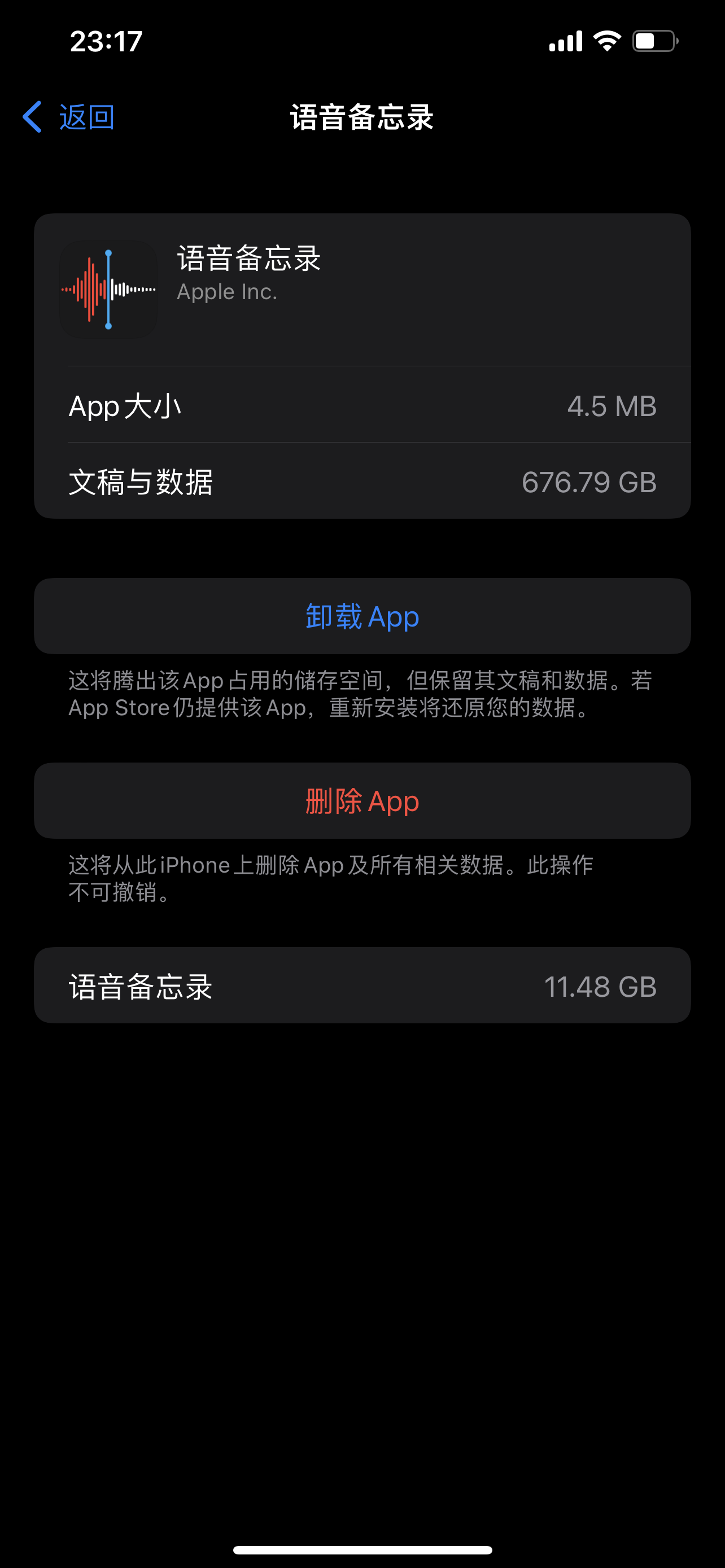 删除了语音备忘录这个App重装也没有反应。还是600多个g.