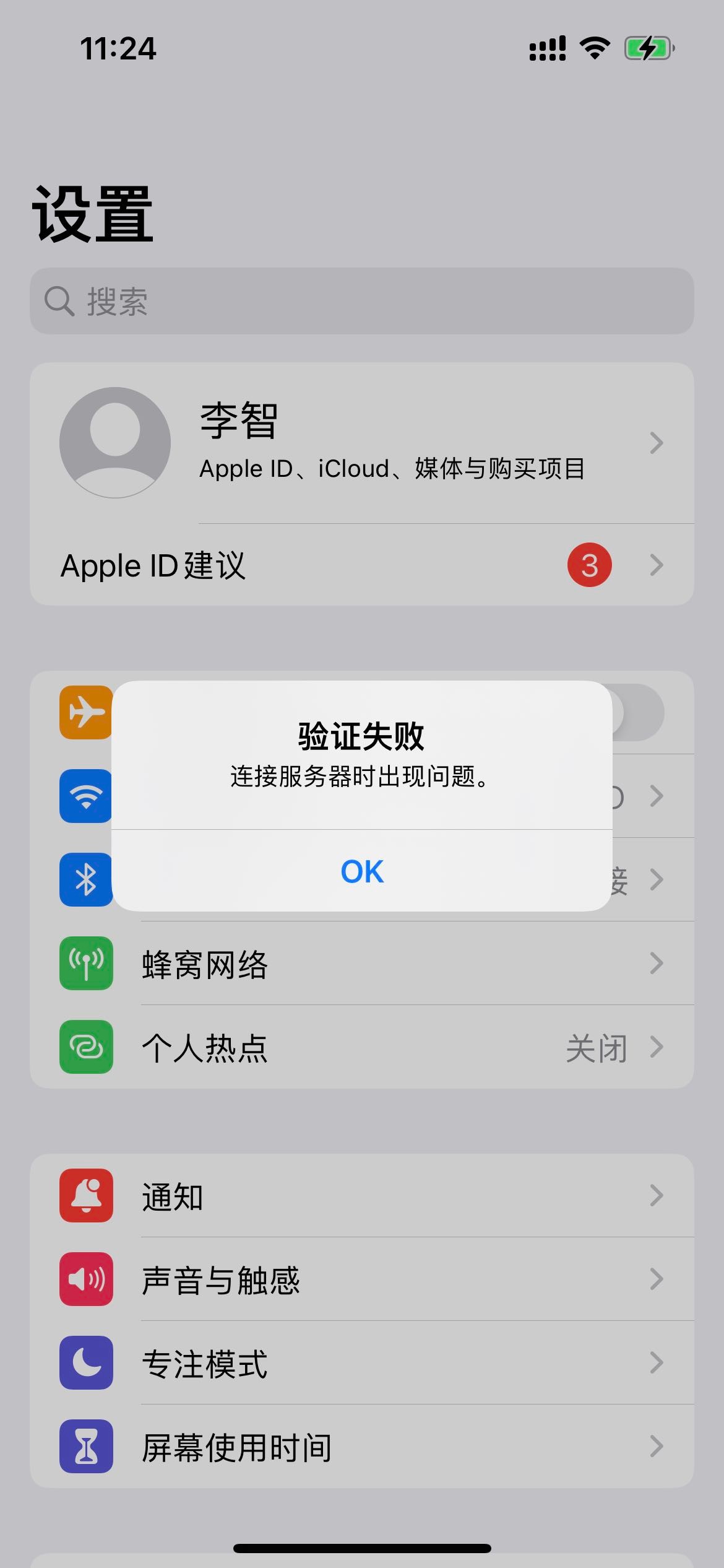 1 设置中,Apple id 建议有提示信息,但点击后,显示验证失败,连接服务器时出现问题。(图1,图2)