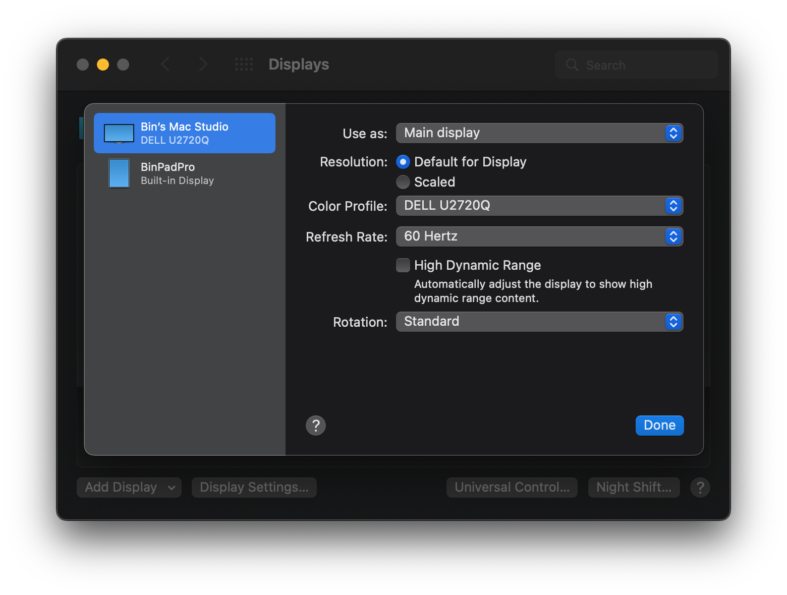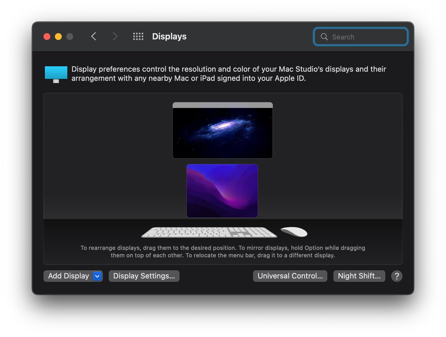 创建新的用户的本意并不是为了解决这个问题,而是为了设置另外一个Apple ID的家庭共享。但是当我设置结束,回到管理员账户时,意外地找不到鼠标指针了。此时我才注意到我实际在控制一旁的iPad Pro上的原点指针。也就是说,这个时候Mac Studio已经自动连接了iPad Pro。打开显示设置,也可以正常看到iPad Pro设置。这里判别iPad Pro是通过sidecar还是Universal Control连接,可以通过壁纸。如果是sidecar的话,两个屏幕会显示同样的壁纸(mac的壁纸);而通过Universal Control连接,则显示不一样的壁纸。