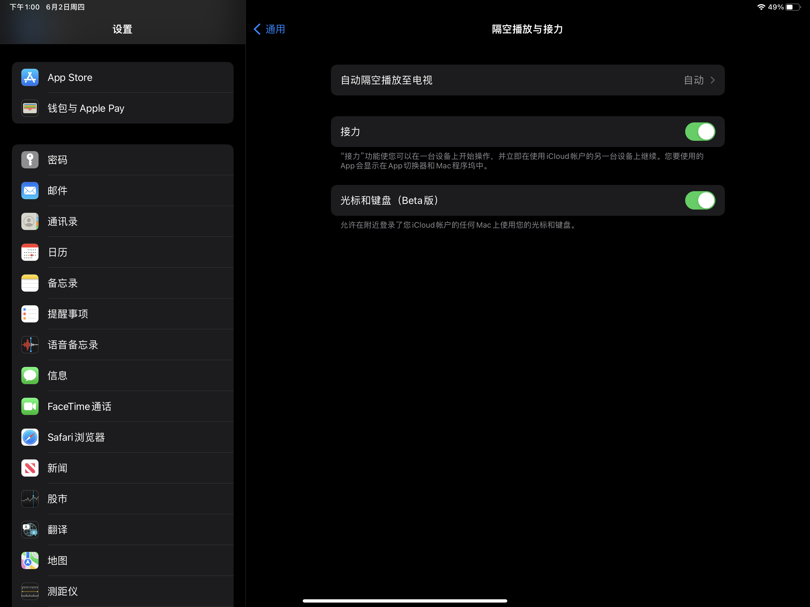 macbookpro2017已经更新至12.4,ipadpro2018已经更新到15.4.1但是还是无法实现公用键盘鼠标,mac外接显示器和有线鼠标,所以相关设置均打开包括ipad隔空播放与接力,以及mac的显示器通用设置