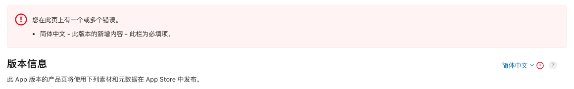 第二次提交审核提示:简体中文 - 此版本的新增内容 - 此栏为必填项
