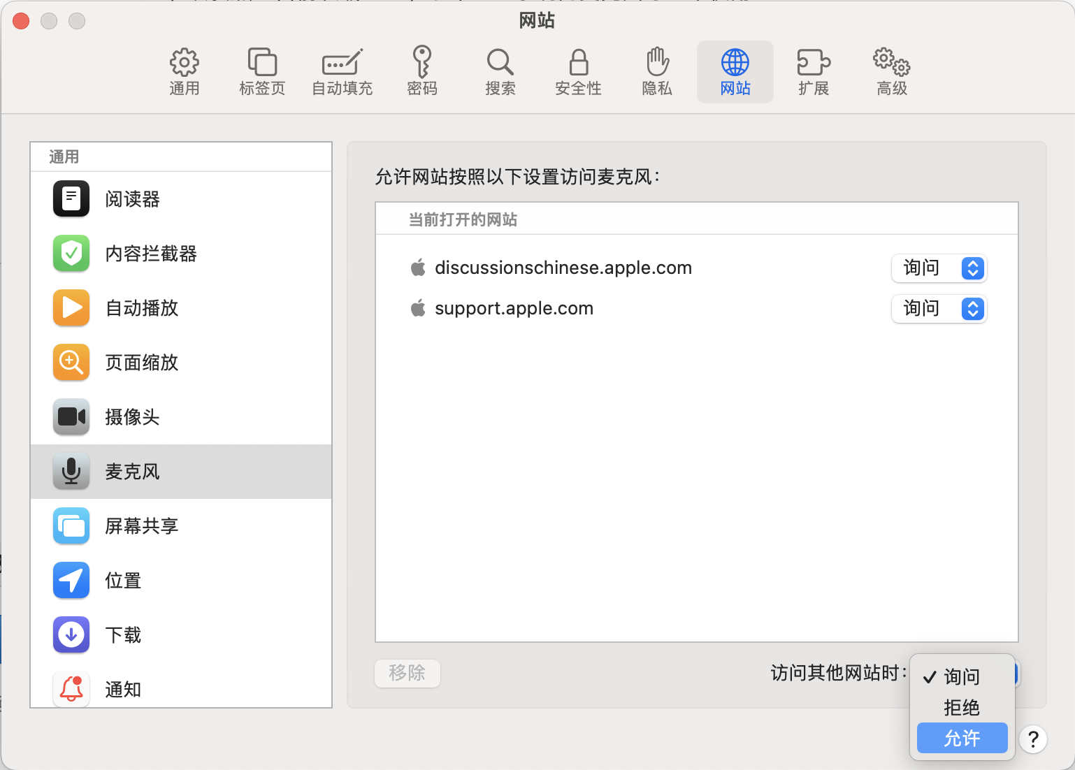在 Safari 中,麦克风的访问权限是以网站来划分的,请打开 Safari 浏览器,点击菜单栏中的“Safari 浏览器”,选择“偏好设置...”。在顶部选择“网站”,在侧边栏选择“麦克风”。右侧会显示你当前已经打开的网站,你可以分别设置它们的麦克风访问权限。你也可以在底部的“访问其他网站时”选择“允许”以允许所有网站访问 Mac 的麦克风(参阅在 Mac 上的 Safari 浏览器中更改“网站”偏好设置)。