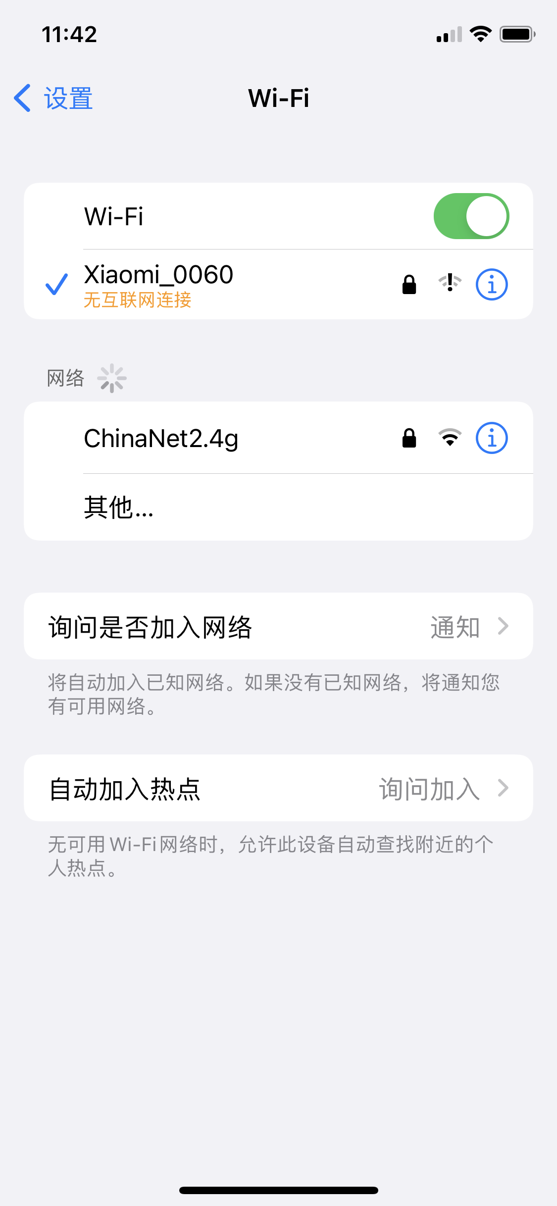 如果您的无线局域网名称下面显示“自动加入已停用”,请轻点它并打开“自动加入”。