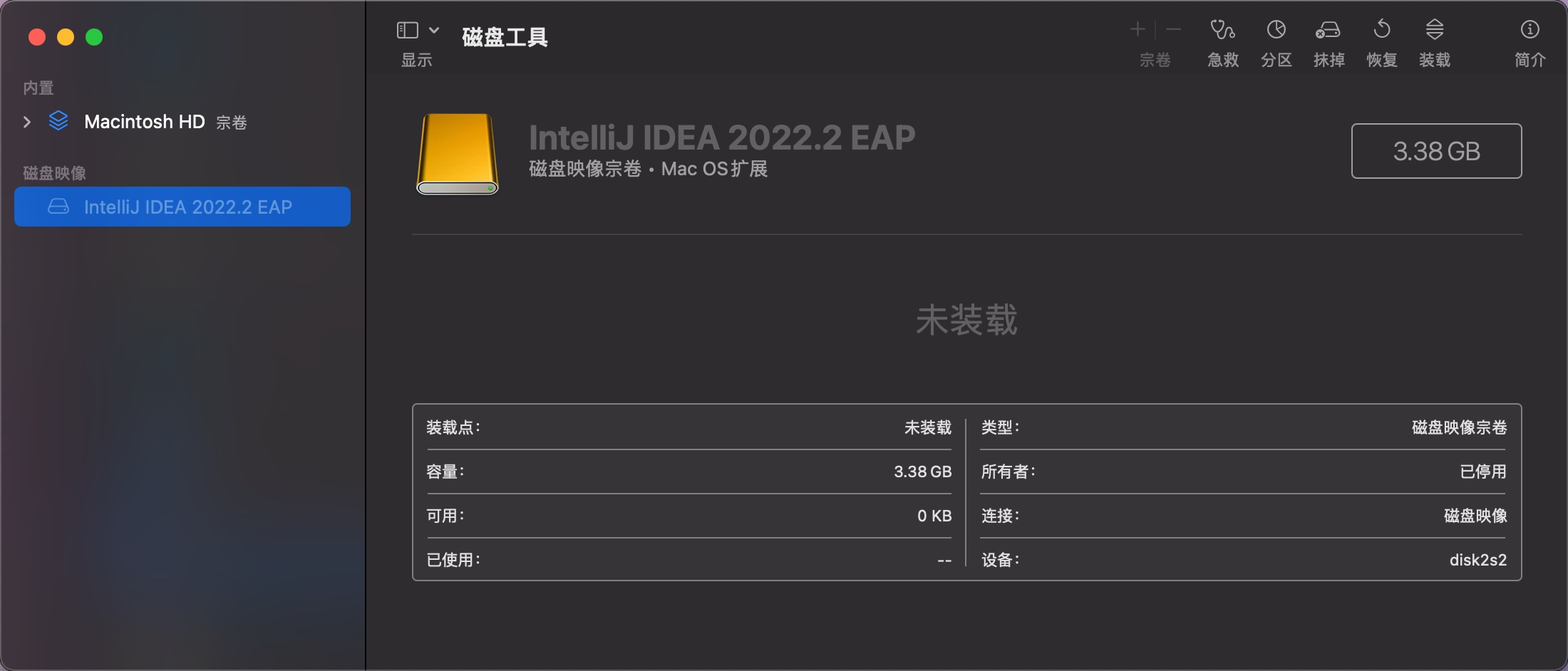 上图为系统版本与电脑型号,现在点击 dmg 安装软件无反应,桌面没有出现已经装载的安装文件,只会在磁盘工具中出现一个未装载的磁盘分区