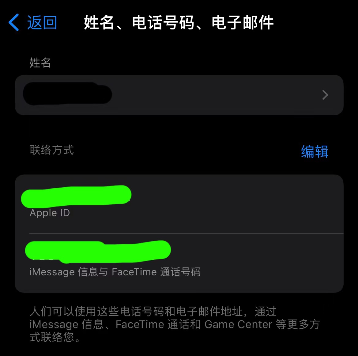 一、首先进入设置,点击个人头像,选择“姓名,电话号码,电子邮件”选项。检查如下图中联络方式是否含有电话号码。