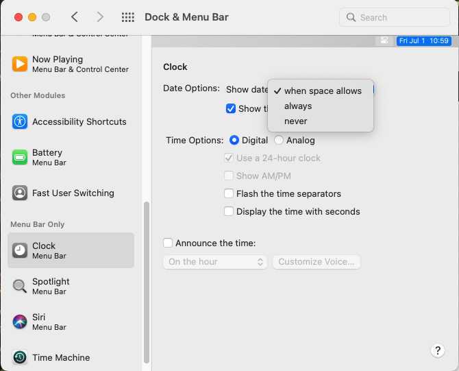 进入到系统偏好设置 --> Dock和菜单栏 --> 往下翻直到你看到时钟,然后在右侧的显示日期下拉菜单中选择“总是”