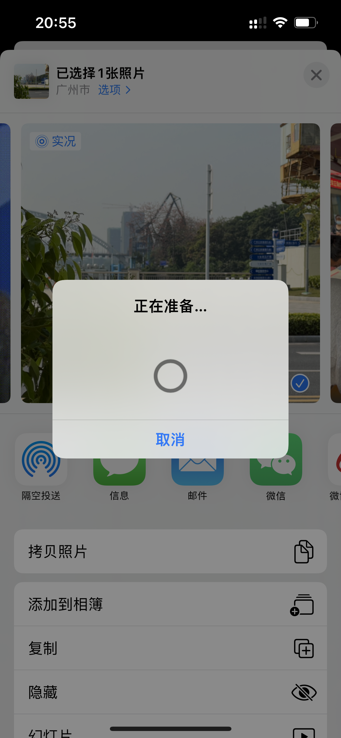 当点击照片的分享按钮,选择发送到微信或者其他软件时,均会出现这种情况。偶尔可以复现,有一些照片会出现这种情况,有一些则不会,可能是兼容性问题。需要重启才能恢复正常。ios15.4.1,iPhone13pro