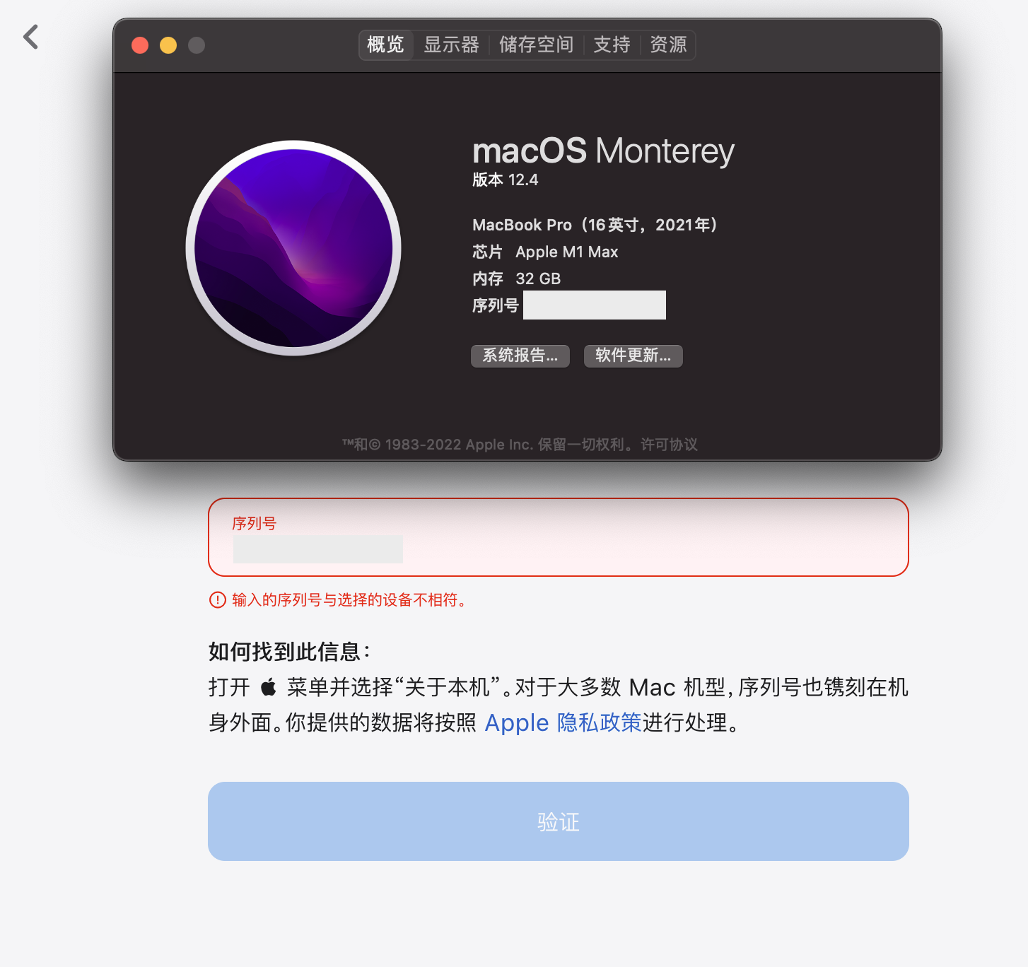 官网换购输入电脑序列号后,提示与选择的设备不相符,为什么?